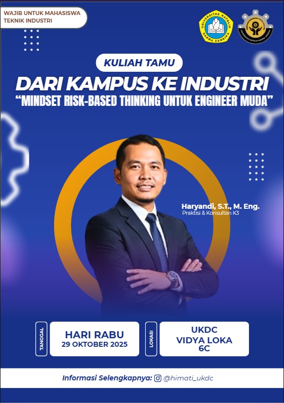 Pada tanggal 29 Oktober 2025, Prodi Teknik Industri mengadakan kegiatan kuliah tamu dengan tema “Mindset Risk-Based Thinking untuk Engineer Muda.” Pada kuliah tamu kali ini, Bapak Haryandi, S.T., M.Eng. seorang Praktisi dan Konsultan K3 turut hadir sebagai narasumber yang membagikan ilmu dan pengalaman, serta membuka wawasan baru bagi mahasiswa. Kegiatan ini diadakan di Gedung Vidya Loka 6C Universitas Katolik Darma Cendika. Mahasiswa baru angkatan 2025 juga turut hadir dalam kegiatan ini sebagai peserta.