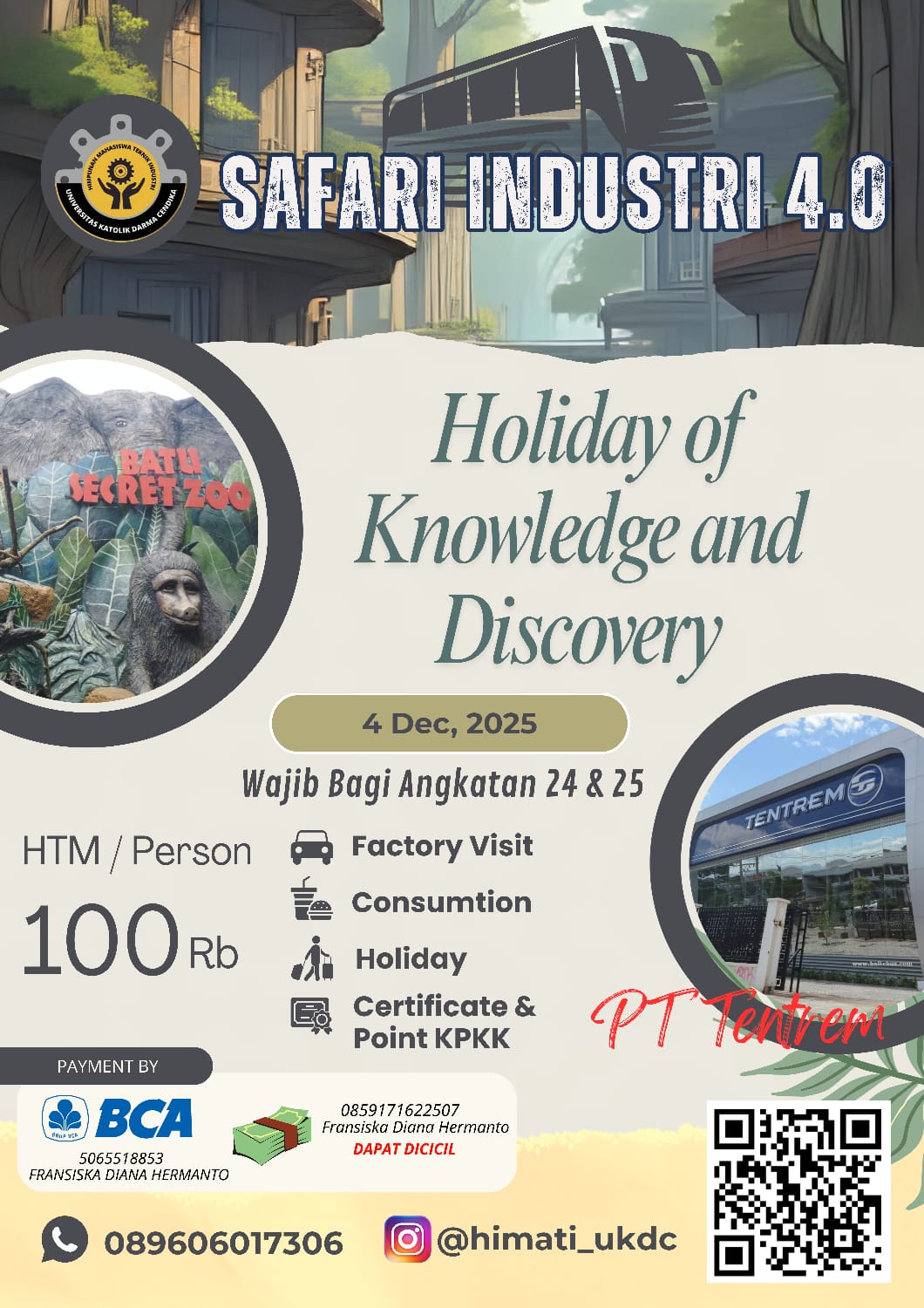 Pada Kamis, 4 Desember 2025 mahasiswa Prodi Teknik Industri angkatan 2024 dan 2025 berkesempatan melakukan perjalanan ke Kota Malang dalam rangka kunjungan Industri di PT Tentrem Sejahtera,Malang dan Batu Secret Zoo.